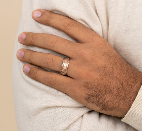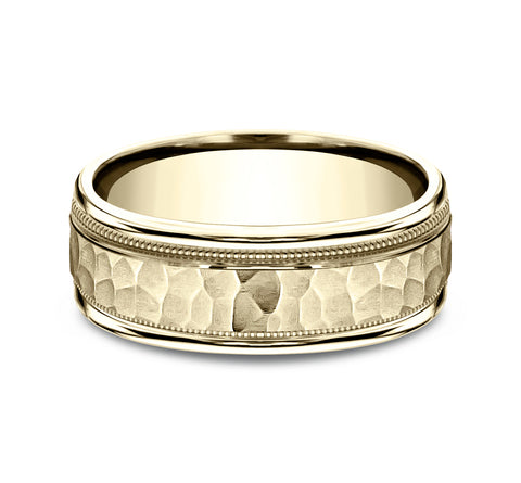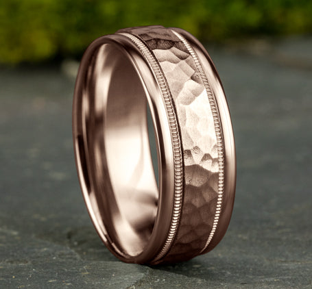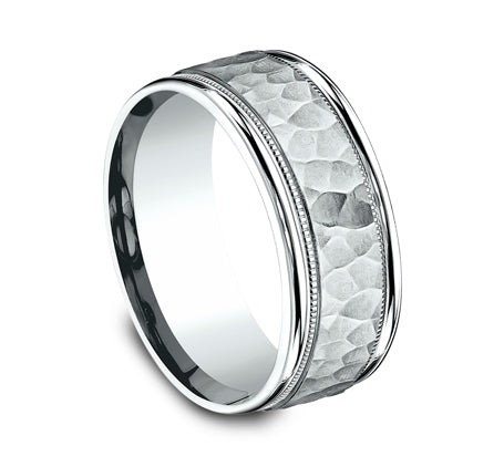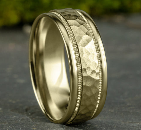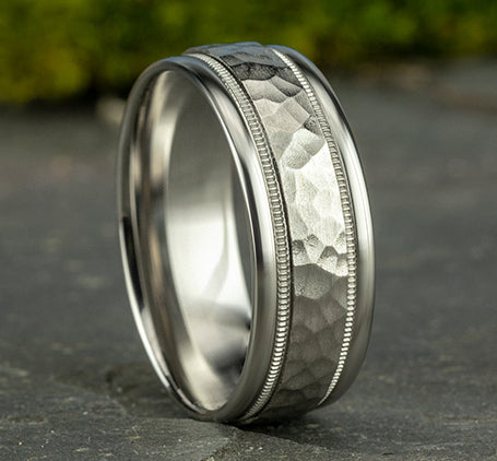 Hammered center, milgrain detailing, polished round edges