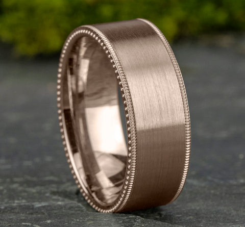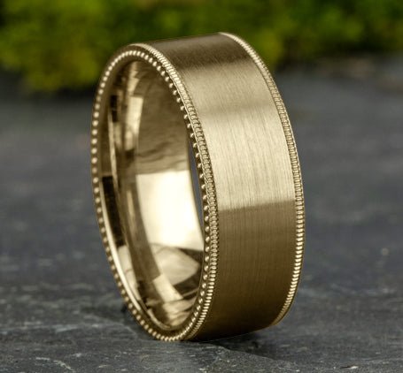 Satin center, milgrain detailing, ball riveted edges